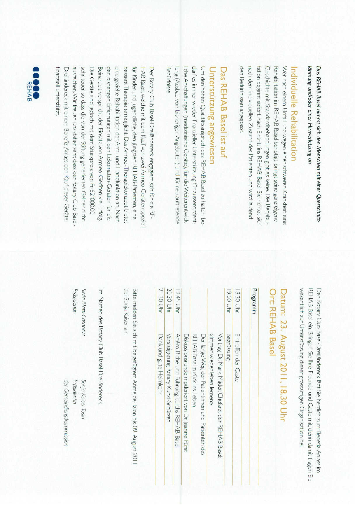 18.30 Uhr Eintreffen / 19.00 Uhr Begrüssung & Vortrag / 19.45 Uhr Apéro Riche und Führung durchs REHAB Basel / 20.30 Uhr Versteigerung / 21.30 Uhr Dank und gute Heimkehr